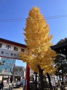 1週間前は豊かに色づいていた高幡不動尊のイチョウの木は、今日見たら葉がほとんど落ちていて
