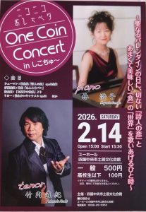 来月2/14(土)、四国中央市土居文化会館ユーホールにて、実力派テノール歌手、全国ツアーやテレビなどでも大活躍中の竹内直紀さんとコンサートをいたします。楽しくて切なくて甘くて美味しい曲目の数々。同級生2人でお届けするバレンタインコンサートです。皆様、是非是非お越し下さい!