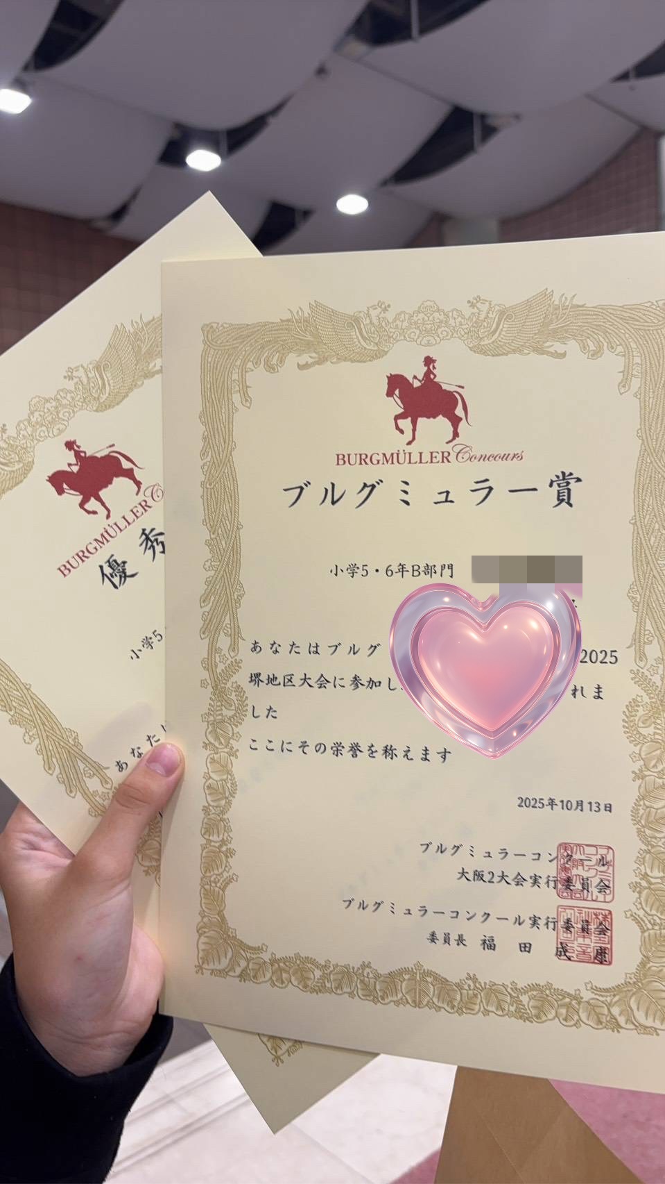 当教室の生徒さんがブルグミュラーコンクールにて優秀賞、及びブルグミュラー賞🏆を受賞されました✨